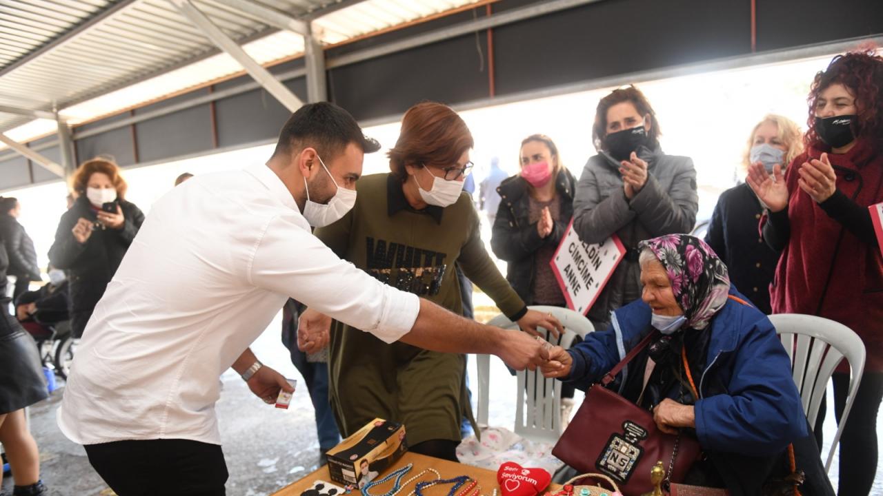 “Yollarda yattım, ortalıkta kaldım, aç kaldım, susuz kaldım.” ifadelerini kullanan Meliha Türkgenç ise şuan çok mutlu olduğunu söyledi. Türkgenç, “Ben dünyaya geldim geleli çok acı günler yaşadım. Yollarda yattım, ortalıkta kaldım, aç kaldım, susuz kaldım en sonunda 10 sene önce bir yer buldum, orada kalıyorum. Bazen oyuncak sattım, bazen mendil sattım. Bazı insanlar bana dilendiğimi söylüyor. Sokak sokak gezerek satış yapmaya çalışıyordum, bazen kazanıyordum bazen kazanamıyordum. Başkanım bana yardım etti, bugün yeniden dünyaya geldim. 71 yaşındayım, bana bu tezgâhı kurdular. Beni sokaklardan kurtardıkları için teşekkür ediyorum. Ben Başkanımı çok seviyorum. O, bana yardım etti.” şeklinde konuştu.